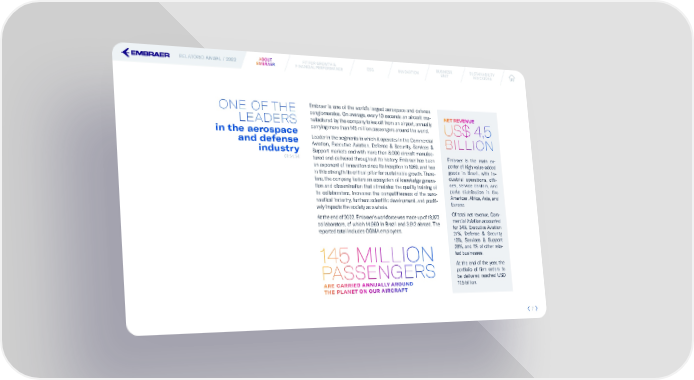 RELATÓRIO ANUAL / 2022 ABABOUOUTT FIT FOR GROWTH & ESG INNOVATION BUSINESS SUSTAINABILITY EMBREMBRAERAER FINANCIAL PERFORMANCE UNIT INDICATORS ONE OF THE Embraer is one of the world’s largest aerospace and defense conglomerates. On average, every 10 seconds an aircraft ma- NET REVENUE LEADERS nufactured by the company takes off from an airport, annually in the aerospace carrying more than 145 million passengers around the world. US$ 4,5 and defense Leader in the segments in which it operates in the Commercial BILLION industry Aviation, Executive Aviation, Defense & Security, Services & Support markets and with more than 8,000 aircraft manufac- GRI 2-1; 2-6 tured and delivered throughout its history, Embraer has been Embraer is the main ex- an exponent of innovation since its inception in 1969, and has porter of high value-added in this strength its critical pillar for sustainable growth. There- goods in Brazil, with in- fore, the company fosters an ecosystem of knowledge genera- dustrial operations, of昀椀- tion and dissemination that stimulates the quality training of ces, service centers, and its collaborators, increases the competitiveness of the aero- parts distribution in the nautical industry, furthers scienti昀椀c development, and positi- Americas, Africa, Asia, and vely impacts the society as a whole. Europe. At the end of 2022, Embraer’s workforce was made up of 18,872 Of total net revenue, Com- collaborators, of which 14,960 in Brazil and 3,912 abroad. The mercial Aviation accounted reported total includes OGMA employees. for 34%, Executive Aviation 27%, Defense & Security 10%, Services & Support 28%, and 1% of other rela- 145 MILLION ted businesses. At the end of the year, the PASSENGERS portfolio of 昀椀rm orders to be delivered reached USD ARE CARRIED ANNUALLY AROUND 17.5 billion. THE PLANET ON OUR AIRCRAFT 7