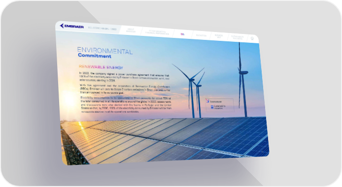 RELATÓRIO ANUAL / 2022 ABOUT FIT FOR GROWTH & ESESGG INNOVATION BUSINESS SUSTAINABILITY EMBRAER FINANCIAL PERFORMANCE UNIT INDICATORS ENVIRONMENTAL Commitment RENEWABLE ENERGY In 2022, the company signed a power purchase agreement that ensures that 100% of the electricity acquired by Embraer in Brazil is from renewable, wind, and solar sources, starting in 2024. With this agreement and the acquisition of Renewable Energy Certi昀椀cates (RECs), Embraer will zero its Scope 2 carbon emissions in Brazil one year earlier than announced in its corporate goal. Electricity consumption in its operations in Brazil accounts for about 70% of the total consumed in all its operations around the globe. In 2022, assessments Learn more: and discussions were also started with the teams in Portugal and the United Sustainability States so that, by 2030, 100% of the electricity consumed by Embraer will be from Indicators renewable sources in all its operations worldwide. 171717