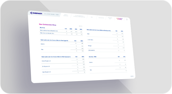 ABOUT BUSINESS SUSTAINABILITY RELATÓRIO ANUAL / 2022 FIT FOR GROWTH & ESG INNOVATION SUSTAINABILITY EMBRAER UNIT INDICATORS FINANCIAL PERFORMANCE INDICATORS New Collaborator Hires (GRI 401-1) New hires Unit 2020 2021 2022 Total number and rate of new collaborator hires by country Unit 2022 Total number of new collaborator hires N. 962 1909 3371 N. 2831 Rate of new collaborator hires % 5,6 12,7 19,5 Brazil % 84,0 N. 497 United States Total number and rate of new collaborator hires by gender Unit 2022 % 14,8 N. 858 N 2 Women Portugal % 25,5 % 0,06 N. 2492 Men Other countries N 41 % 73,9 Total number and rate of new collaborator hires by age group Unit 2022 New hires - STEM Unit 2022 N. 1598 Under 30 years old N. 199 % 47,4 Women N. 1567 % 26 30-50 years old % 46,5 N. 561 N. 206 Men Over 50 years old % 6,1 74 107