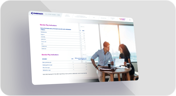 ABOUT BUSINESS SUSTAINABILITY RELATÓRIO ANUAL / 2022 FIT FOR GROWTH & ESG INNOVATION SUSTAINABILITY EMBRAER UNIT INDICATORS FINANCIAL PERFORMANCE INDICATORS Gender Pay Indicators (GRI 405-2) Ratio of the basic salary of women to men for each collaborator % 2022 category Administrative % 86 Engineer % 90 Internship % 100 Leadership % 87 Operational % 74 Pilot % - Professional % 89 Technician % 74 Gender Pay Indicators (GRI 405-2) Indicator Unit Difference between men and women collaborators Mean gender pay gap % 8% Median gender pay gap % 0% Mean bonus gap % 14% Median bonus gap % 5% Note: Data Coverage (% FTEs): 95% (Apprentices, Interns, and Eve collaborators were not considered). 115115