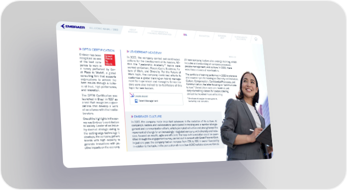 RELATÓRIO ANUAL / 2022 ABOUT FIT FOR GROWTH & ESESGG INNOVATION BUSINESS SUSTAINABILITY EMBRAER FINANCIAL PERFORMANCE UNIT INDICATORS GPTW CERTIFICATION LEADERSHIP ACADEMY GRI 404; 3-3 Embraer has been In 2022, the company carried out continuous All new company leaders also undergo training, which recognized as one actions for the development of its leaders. Wi- includes understanding all company processes, of the best com- thin the “Leadership Academy”* topics were people management, and culture. In 2022, there panies to work in worked on Culture, People Cycle, Business, Fu- were three classes of new leaders. a survey performed by Gre- ture of Work, and Diversity. For the Future of The portfolio of training performed in 2022 is extensive at Place to Work®, a global Work topic, the company combined efforts to and covered speci昀椀c training on Diversity and Inclusion, consulting 昀椀rm that supports customize a global training on hybrid manage- Culture, Compensation, Con昀椀dential Processes, and organizations to achieve the ment for supervisors and managers. Senior lea- Communication, the latter focusing on “communicate best results through a cultu- ders were also trained to be facilitators of this to lead.” Overall, there were one hundred and re of trust, high performance, topic for new leaders. sixty-six training classes for leaders, totaling and innovation. almost 昀椀ve hundred hours of training. The GPTW Certi昀椀cation was Learn more: * Development program in management, launched in Brazil in 1997 as Talent Management leadership, and innovation. a seal that recognizes organi- zations that develop a work of excellence with their colla- borators. One of the highlights in the sur- EMBRAER CULTURE vey was Embraer’s contribution In 2022, the company made important advances in the evolution of its culture. All to society. Leader of an indus- company’s leaders and collaborators participated in training and a number of enga- try deemed strategic owing to gement and communication efforts, which prompted re昀氀ection and strengthened the the cutting-edge technology it movement of change for an increasingly integrated company, with diversity and inclu- develops, the company gathers sion, focused on results, agile and ef昀椀cient. The leap in this evolution could be quan- talents with high capacity to ti昀椀ed through the engagement survey, carried out in concert with Great Place to Work. generate innovations with po- In just one year, the company had an increase from 72% to 78% in overall favorability sitive impacts on the economy. in relation to the topic, in the perception of more than 8,000 collaborators worldwide. 2424