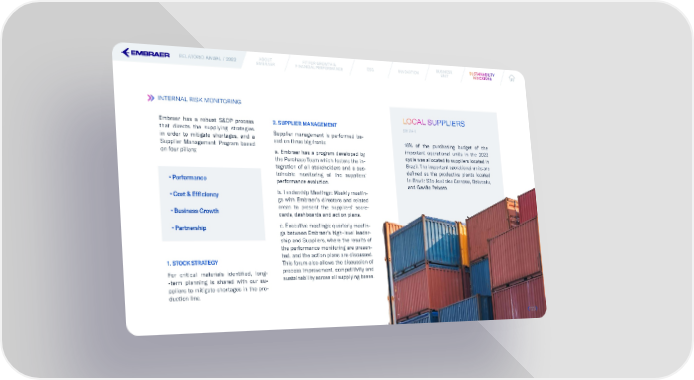 RELATÓRIO ANUAL / 2022 ABOUT FIT FOR GROWTH & ESG INNOVATION BUSINESS SUSUSSTTAINABILAINABILITITYY EMBRAER FINANCIAL PERFORMANCE UNIT INDICINDICAATTORORS S INTERNAL RISK MONITORING LOCAL SUPPLIERS Embraer has a robust S&OP process 2. SUPPLIER MANAGEMENT (GRI 204-1) that directs the supplying strategies Supplier management is performed ba- in order to mitigate shortages, and a sed on three big fronts: 16% of the purchasing budget of the Supplier Management Program based important operational units in the 2022 on four pillars: a. Embraer has a program developed by cycle was allocated to suppliers located in the Purchase Team which fosters the in- Brazil. The important operational units are tegration of all stakeholders and a sus- de昀椀ned as the productive plants located • Performance tainable monitoring of the suppliers’ in Brazil: São José dos Campos, Botucatu, performance evolution. and Gavião Peixoto. • Cost & Ef昀椀ciency b. Leadership Meetings: Weekly meetin- gs with Embraer’s directors and related • Business Growth areas to present the suppliers’ score- cards, dashboards and action plans. • Partnership c. Executive meetings: quarterly meetin- gs between Embraer’s high-level leader- ship and Suppliers, where the results of the performance monitoring are presen- ted, and the action plans are discussed. 1. STOCK STRATEGY This forum also allows the discussion of For critical materials identi昀椀ed, long- process improvement, competitivity and -term planning is shared with our su- sustainability across all supplying bases. ppliers to mitigate shortages in the pro- duction line. 123