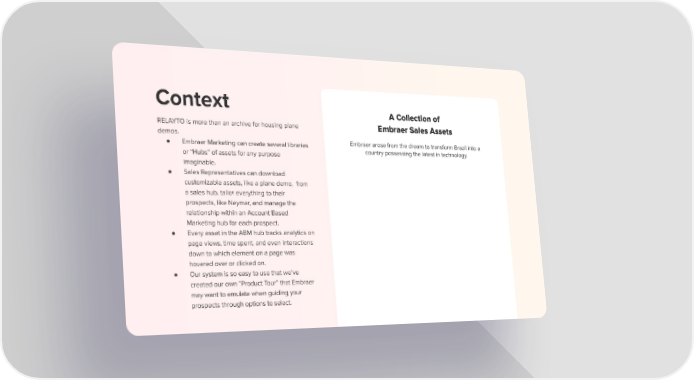 Context A Collection of RELAYTO is more than an archive for housing plane Embraer Sales Assets demos. Embraer arose from the dream to transform Brazil into a ● Embraer Marketing can create several libraries country possessing the latest in technology. or “Hubs” of assets for any purpose imaginable. ● Sales Representatives can download customizable assets, like a plane demo, from a sales hub, tailor everything to their prospects, like Neymar, and manage the relationship within an Account Based Marketing hub for each prospect. ● Every asset in the ABM hub tracks analytics on page views, time spent, and even interactions down to which element on a page was hovered over or clicked on. ● Our system is so easy to use that we’ve created our own ”Product Tour” that Embraer may want to emulate when guiding your prospects through options to select.